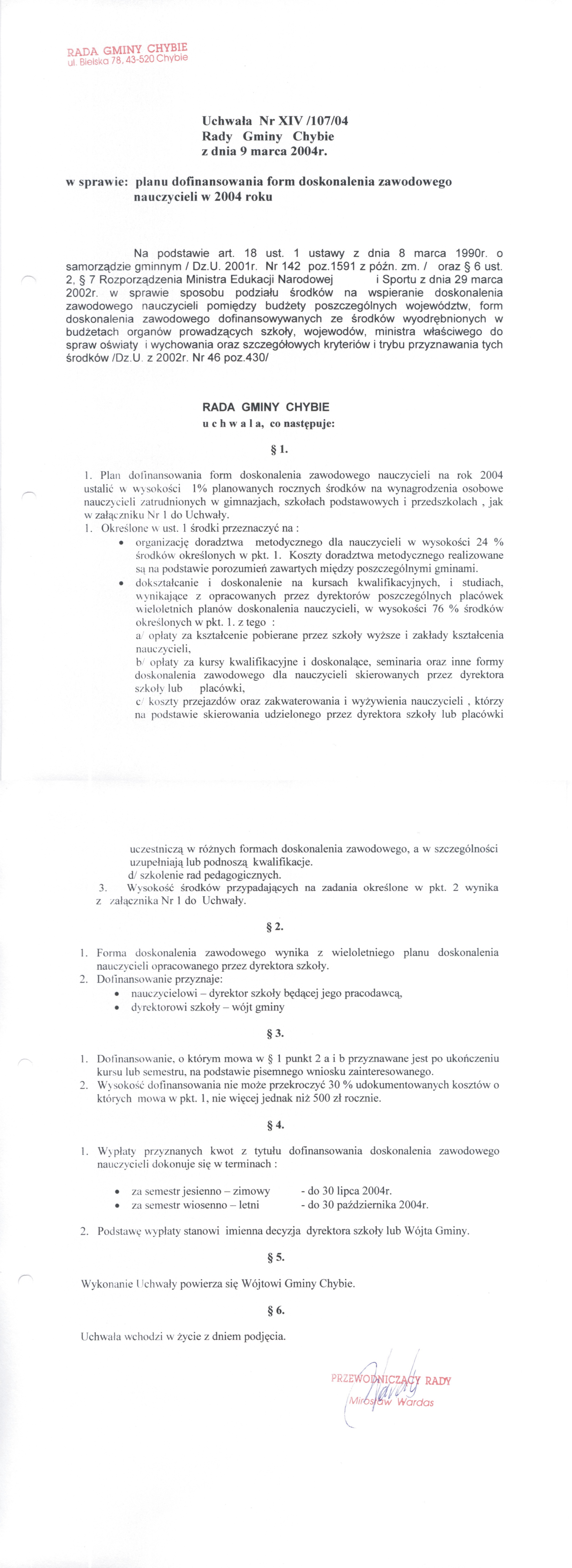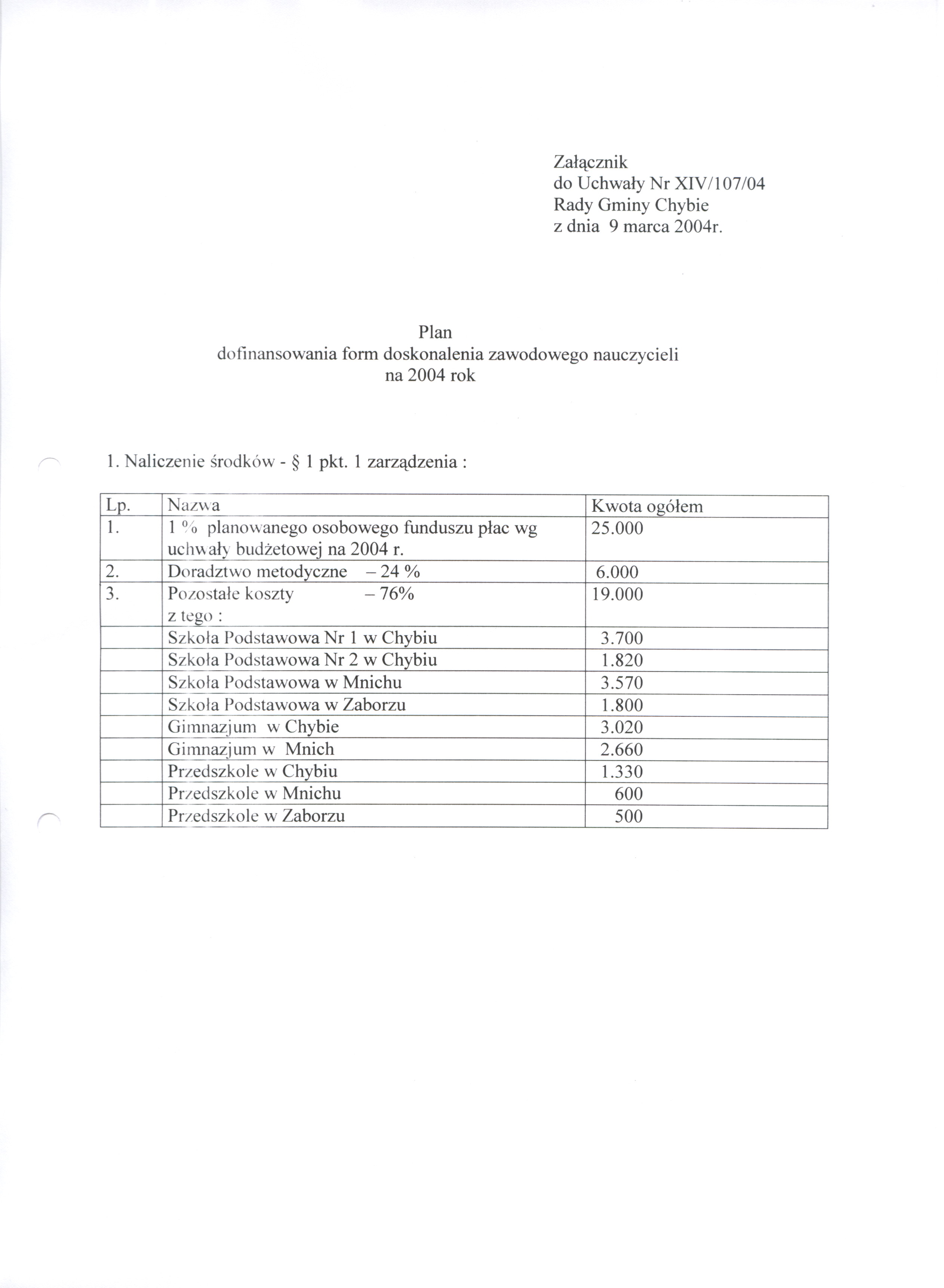 | Typ | Rozmiar | Pobierz | Komentarz | Data dodania | Licznik | graf. | 1476 KB | POBIERZ | Uchwała Nr XIV/107/04 Rady Gminy Chybie z dnia 09 marca 2004 r. w sprawie planu dofinansowania form doskonalenia zawodowego nauczycieli w 2004 roku | 2004-05-04 12:50:57 | 315 | graf. | 490.1 KB | POBIERZ | Załącznik do Uchwały Nr XIV/107/04 Rady Gminy Chybie z dnia 09 marca 2004 r. - Plan dofinansowania form doskonalenia zawodowego nauczycieli w 2004 roku | 2004-05-04 12:50:57 | 323 |