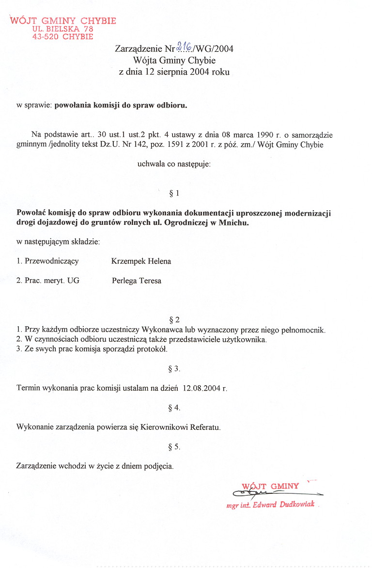 | Typ | Rozmiar | Pobierz | Komentarz | Data dodania | Licznik | graf. | 139.5 KB | POBIERZ | Zarządzenie Nr 216/WG/04 Wójta Gminy Chybie z dnia 12 sierpnia 2004 r. w sprawie powołania komisji do spraw odbioru | 2005-01-18 10:44:32 | 232 |