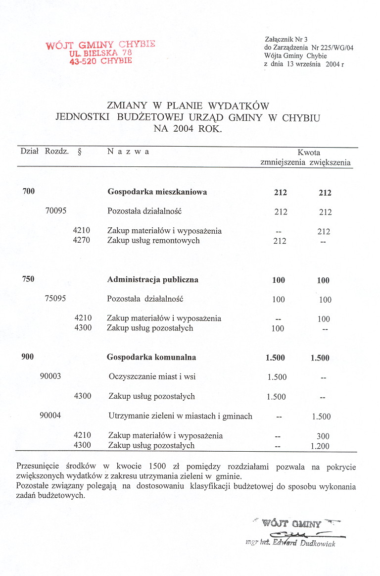 graf. | 164.4 KB | POBIERZ | Zarządzenie Nr 225/WG/04 Wójta Gminy Chybie z dnia 13 września 2004 r. w sprawie zmian w budżecie gminy na 2004 rok | 2005-01-18 09:15:43 | 218 |