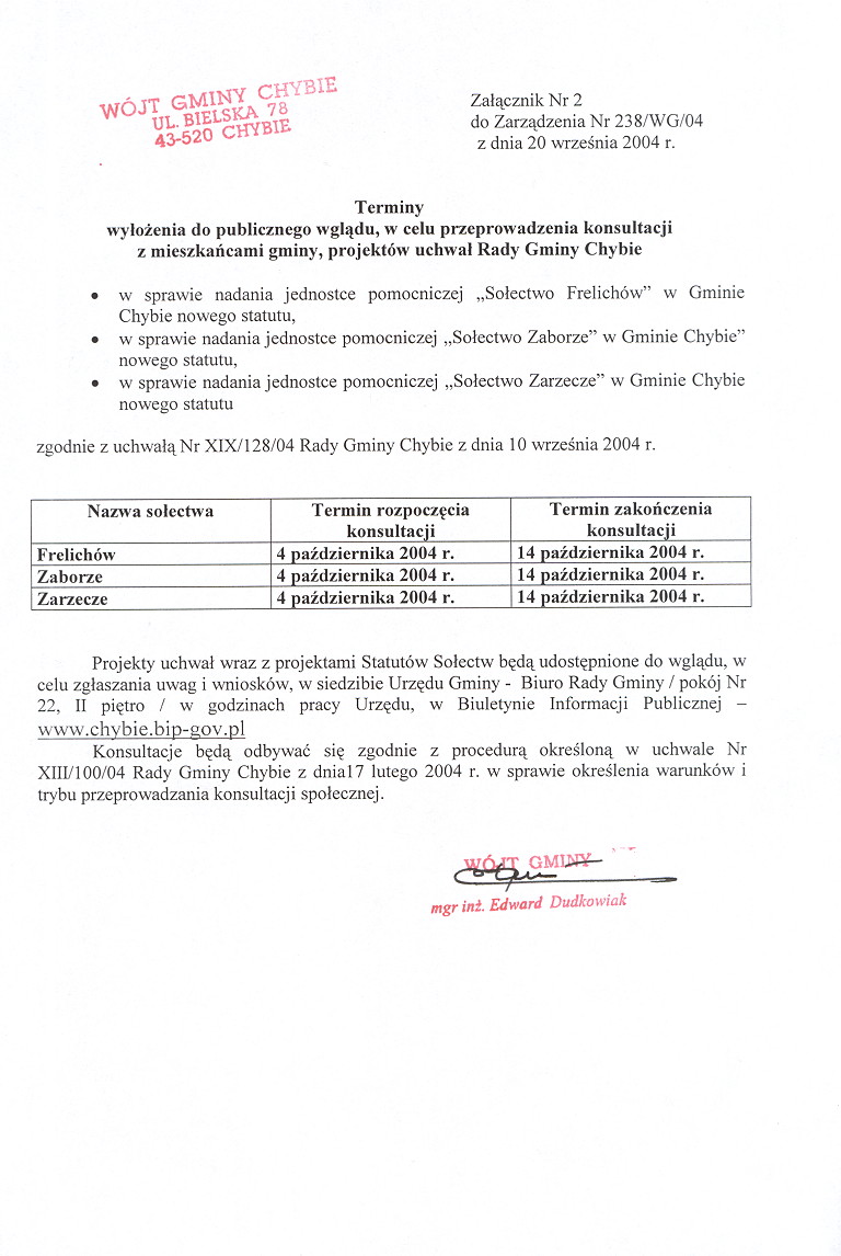 | Typ | Rozmiar | Pobierz | Komentarz | Data dodania | Licznik | graf. | 153.5 KB | POBIERZ | Załącznik Nr 1 do Zarządzenia Nr 238/WG/04 Wójta Gminy Chybie z dnia 20 września 2004 r. | 2005-01-17 09:13:37 | 193 | graf. | 167.8 KB | POBIERZ | Załącznik Nr 2 do Zarządzenia Nr 238/WG/04 Wójta Gminy Chybie z dnia 20 września 2004 r. | 2005-01-17 09:13:37 | 193 | graf. | 229.5 KB | POBIERZ | Zarządzenie Nr 238/WG/04 Wójta Gminy Chybie z dnia 20 września 2004 r. w sprawie przeprowadzenia konsultacji społecznej z mieszkańcami gminy | 2005-01-17 09:13:37 | 190 |