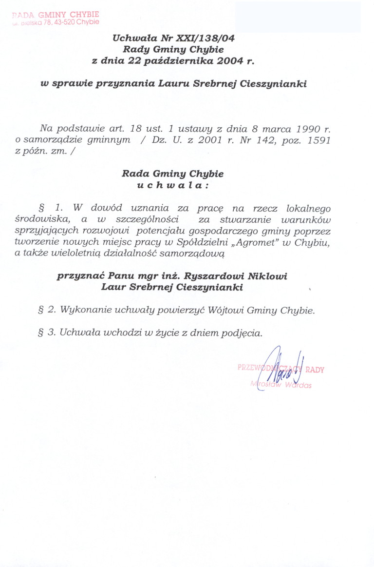 | Typ | Rozmiar | Pobierz | Komentarz | Data dodania | Licznik | graf. | 125.8 KB | POBIERZ | Uchwała Nr XXI/138/2004 Rady Gminy Chybie z dnia 22 października 2004r. w sprawie przyznania Lauru Srebrnej Cieszynianki | 2004-12-02 13:44:11 | 297 |