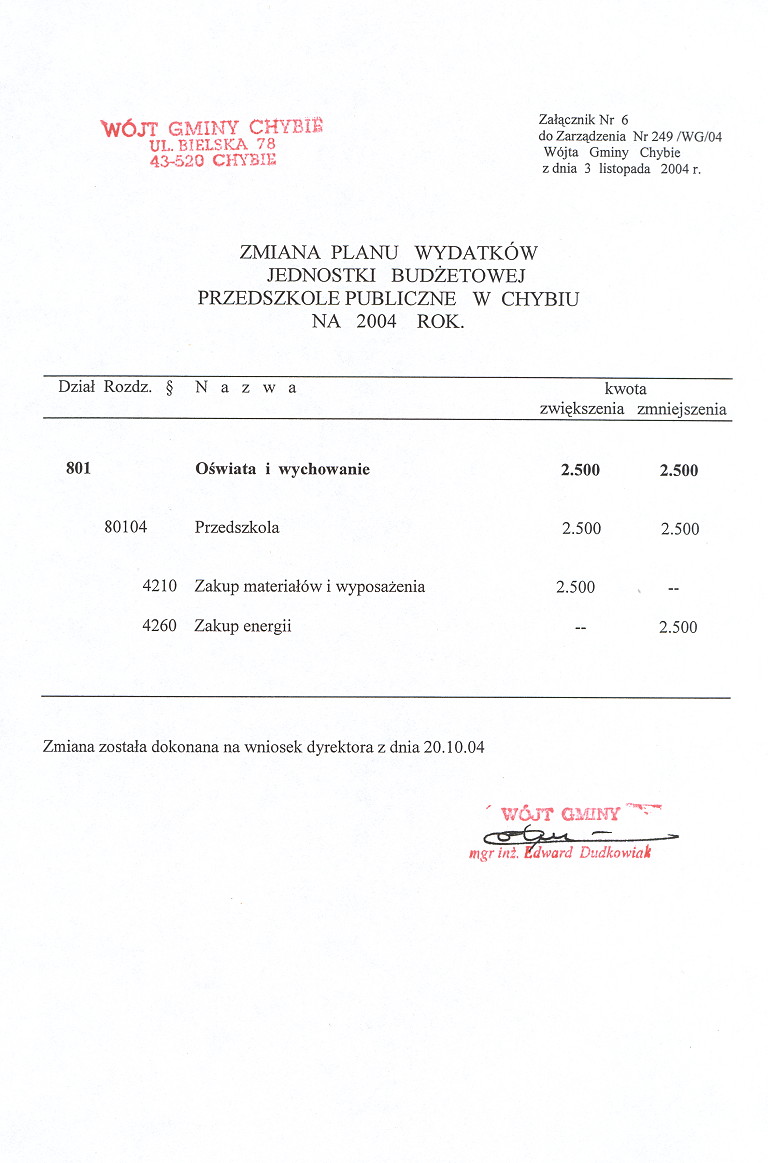 graf. | 167.2 KB | POBIERZ | Zarządzenie Nr 249/WG/04 Wójta Gminy Chybie z dnia 3 listopada 2004 r. w sprawie zmian w budżecie gminy na 2004 rok | 2005-01-12 14:44:59 | 211 |